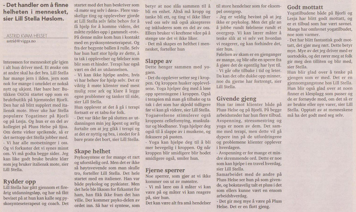 “Jeg er rørt over mottakelsen,” uttaler psykosynteseterapeut og yogalærer Lill Stella Høslom til media. Under overskriften “Alt henger sammen” er Lill intervjuet i lokalavisen Vigga på Dombås (2.10.2014), der hun forteller om psykosyntesen, yoga og sine øvrige tilbud på Bjorli øverst i Gudbrandsdalen der hun bor med sin familie.